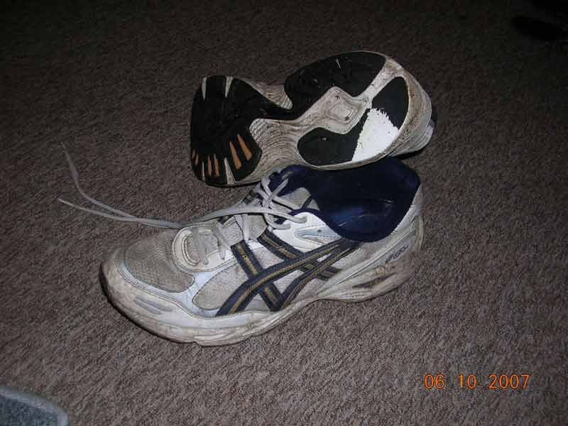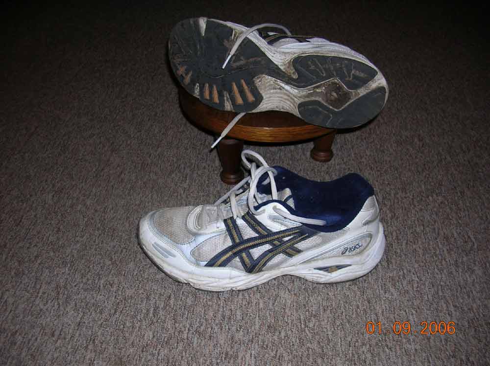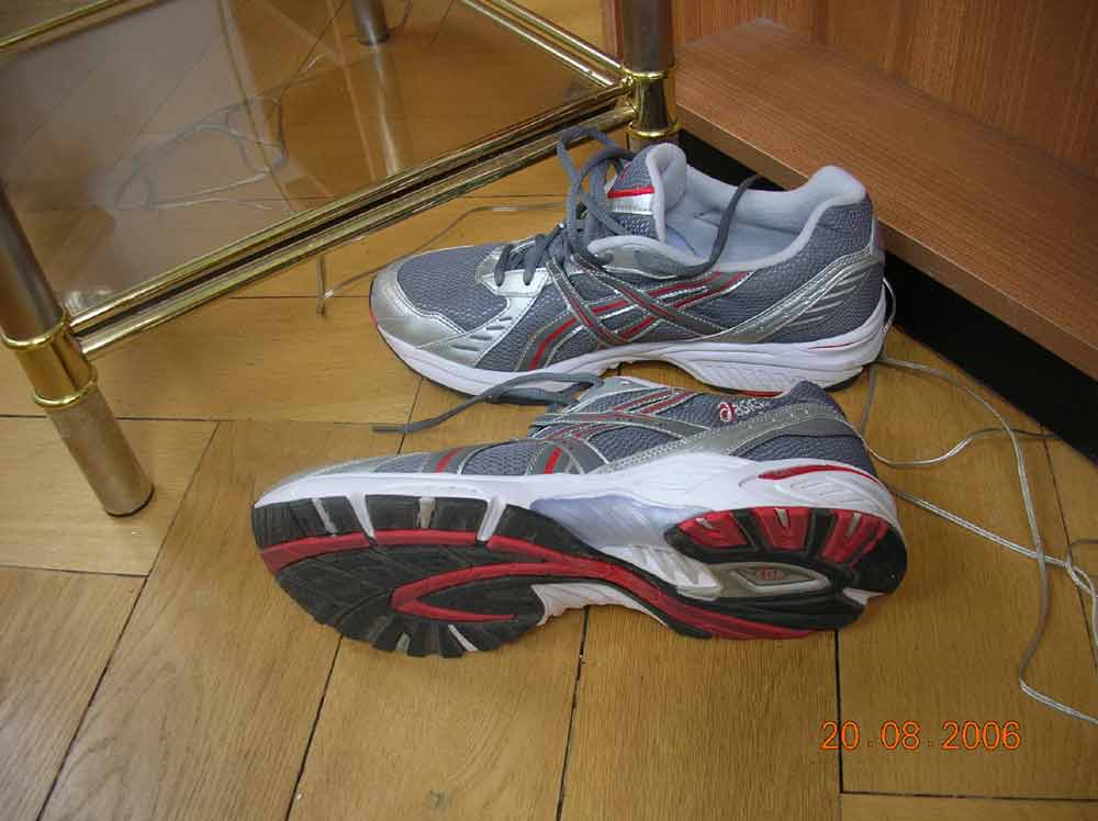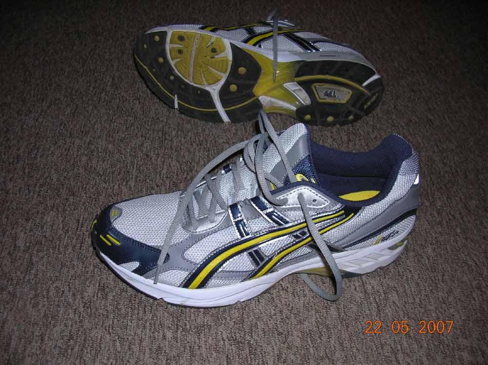 diesmal  Gel Fusion TN 624.  Sehen modern aus, sind aber keine High Tech. Liefen sich ganz gut, bei Trainig wie bei Wettkampf, ca 1600 km, seit 18.8.2006, Einsatz ca. 4 Jahre.  |