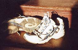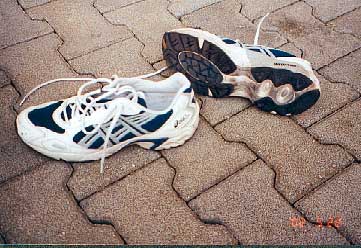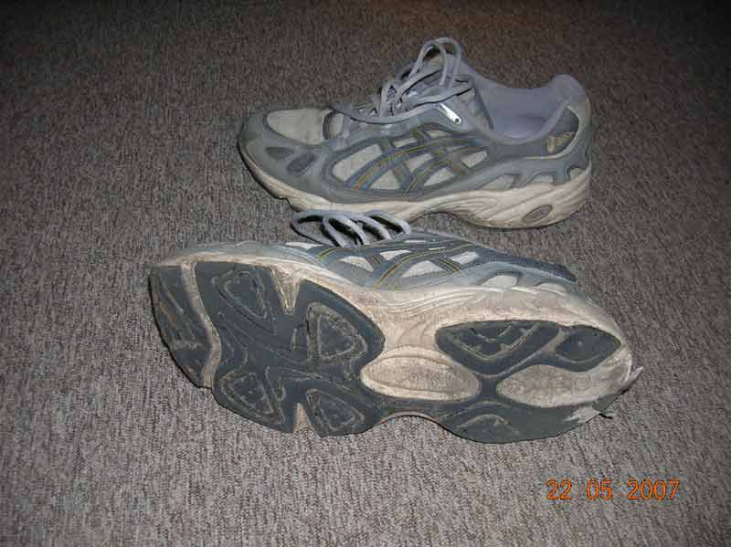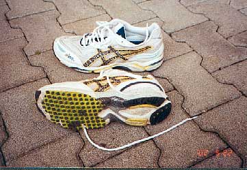Die Turnschuhpreise sind nach der Euro-Einführung explodiert. 100 Euro für ein Paar Laufschuhe zu verlangen gehört heute zum guten Ton im modernen Laufgeschäft. Also mußte ich zum Discounter METRO ausweichen. Die haben zwar keine große Auswahl und keine Beratung, es war auch das einzige Paar, das (fast) paßte. Eigentlich sind sie 1 Nummer zu groß. Aber sie fallen beim Laufen nicht ab, dicke Sohle und pflegeleichter Stoff. Gute Asics, aber eben mehr fürs Training. Passen wegen der Größe auch in kaum eine Tasche. Modell Gel-Evation TN 333, Indienst: 9.5.2005, Preis: 28,99 EUR, 1500 km. Außer Dienst: 08.10.2007. Sohle lief sich wieder ab - hier | |