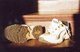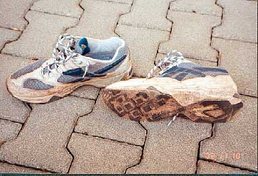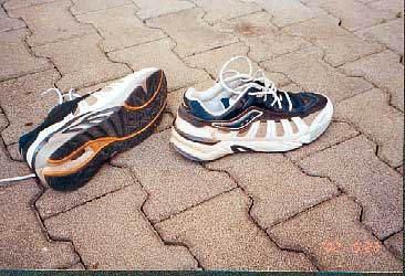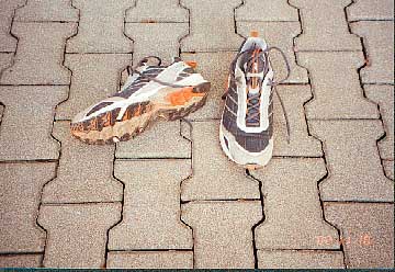 Fühlen sich gut an, vielleicht ein bißchen weich, die Sohle aber abriebsicher. Wenn ich die nicht mal irgendwo stehen lasse, werde ich sie nie los.  Indienststellung Februar 2001, Preis bei Horten 99,95 DM. Abgang November 2005, ca 1800 km.  |